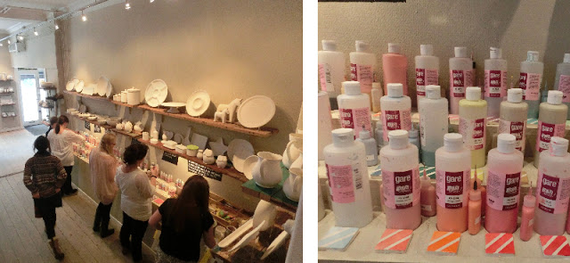 You then browse the shelves of plain, unfinished ceramics and once you have made a choice, tell one of the super helpful assistants who will bring the piece to your work space. You then chose your paints, stamps, stencils etc from a selection available. There are baskets of magazines and books for inspiration. The staff are also ready to answer any questions and on your first visit run though everything with you when you arrive.