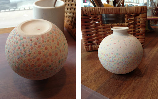 Having made the mistake years ago at a similar place in the UK, where I sat and stared empty minded at my chosen piece of ceramic for about half an hour, I now plan what I will paint before I come. This time I wanted to do a delicate pastel vase and inspired by the constant presence of snow this winter I chose to do a confetti snow fall – I hope it comes out as well as I imagine.