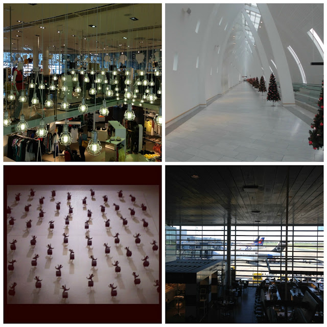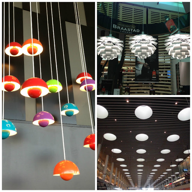 Copenhagen Airport, as you would imagine in a country renowned for its design, is another story altogether. Everywhere you look at the airport there is something that catches your eye, somethings elegant or beautiful, whether it is the flower pot lights by Verner Panton in one of the main bar/restaurant areas (bottom left below) to the little people dancing on the wall (above left) to the churchlike walkway (top right above).