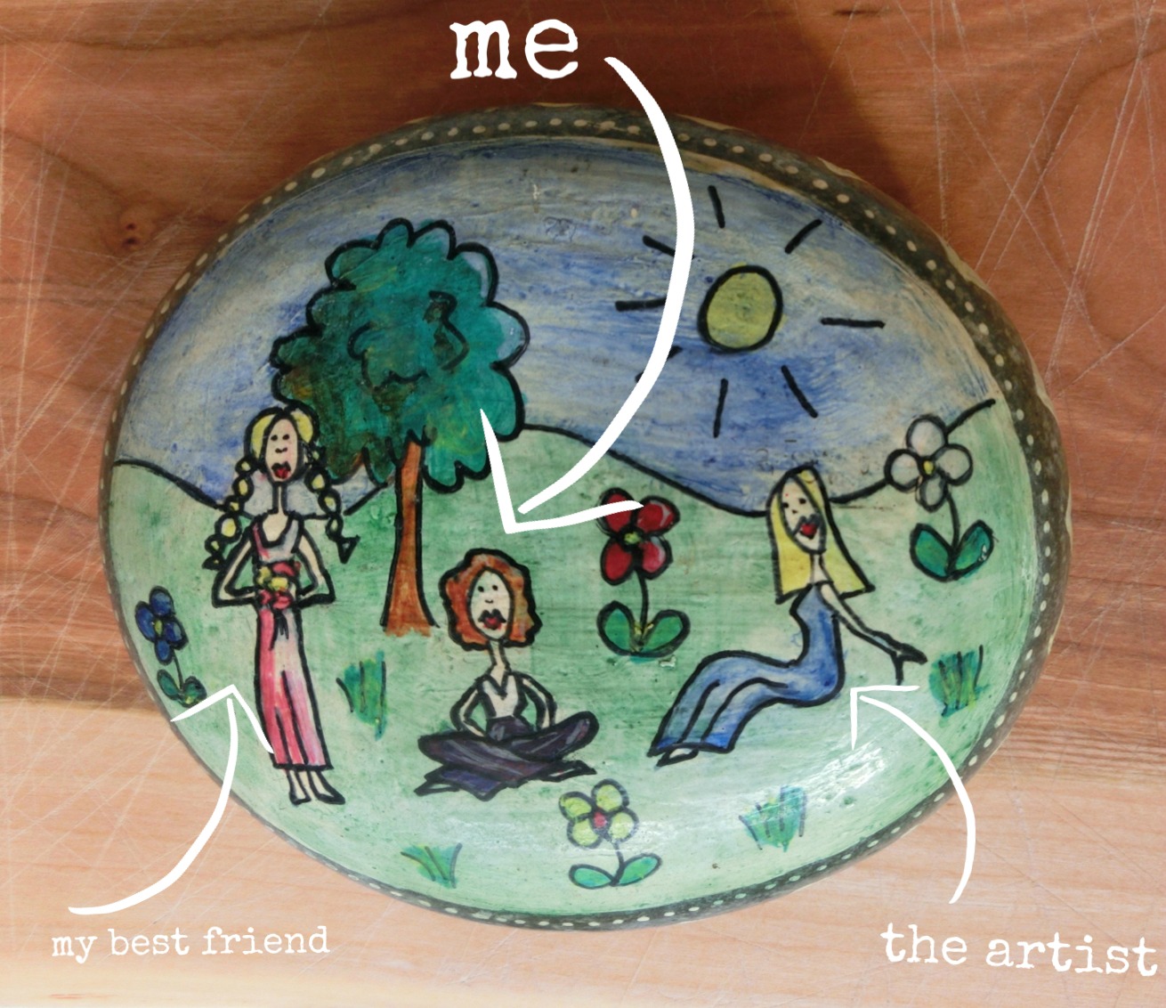 She would be delighted that I still keep this stone painted by another close school friend, capturing the three of us in our hippy phase, in our favourite clothes from the time – it is one of my most treasured possessions and reminds me of being young and to be hopeful.