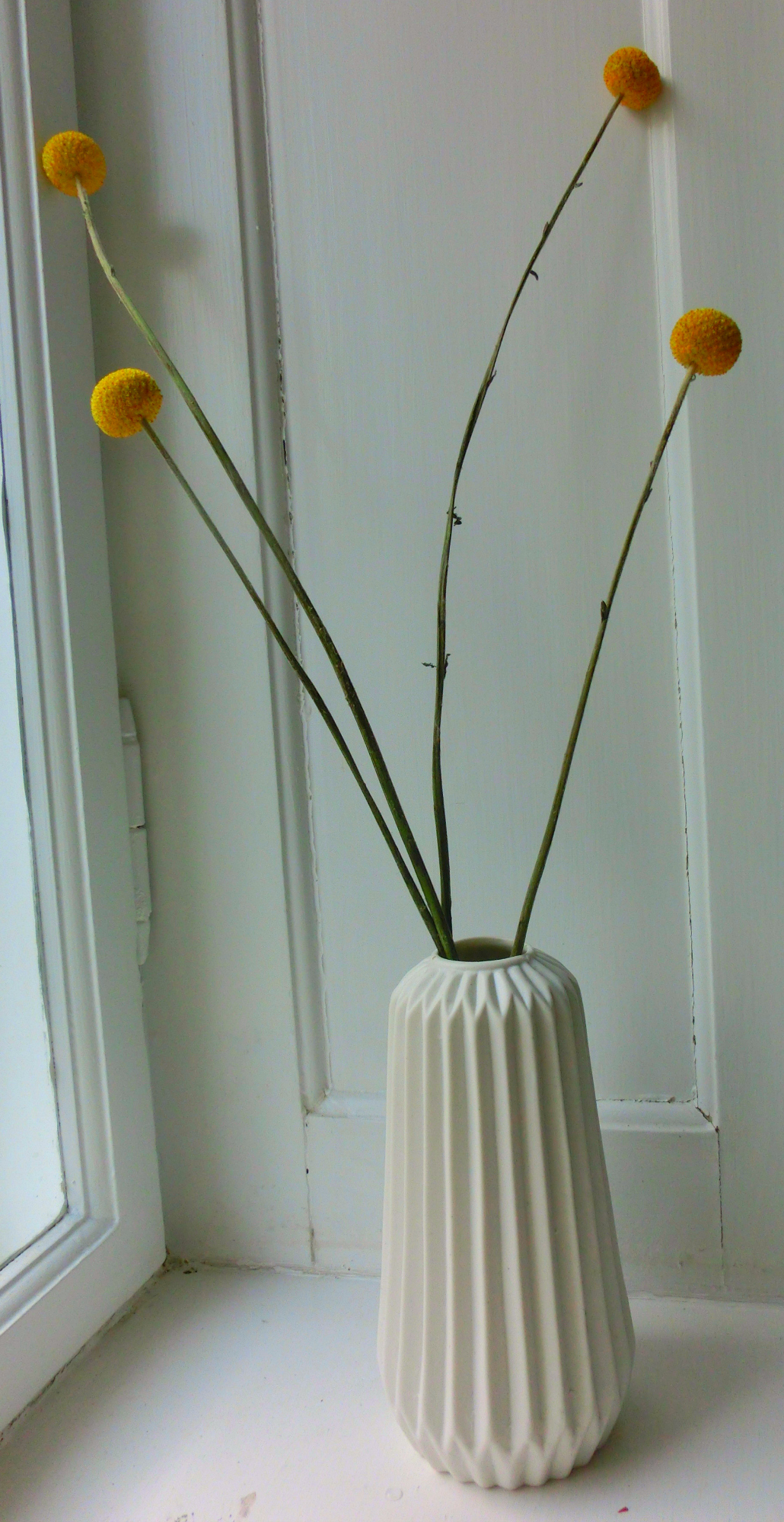 I love having flowers, either cut or plants, in my home and the florists here are very seasonal in their offering so reflect the changes of the year. I wanted to have a new 52 week photo project this year and I have settled on weekly flowers. Maybe not the most original thing to post about but looking through my photos for this last year flowers feature very prominently in them and flowers always make people smile, yes? So here is the first of fifty two photos…cheery yellow billy buttons, trommerstikker or more correctly craspedia.