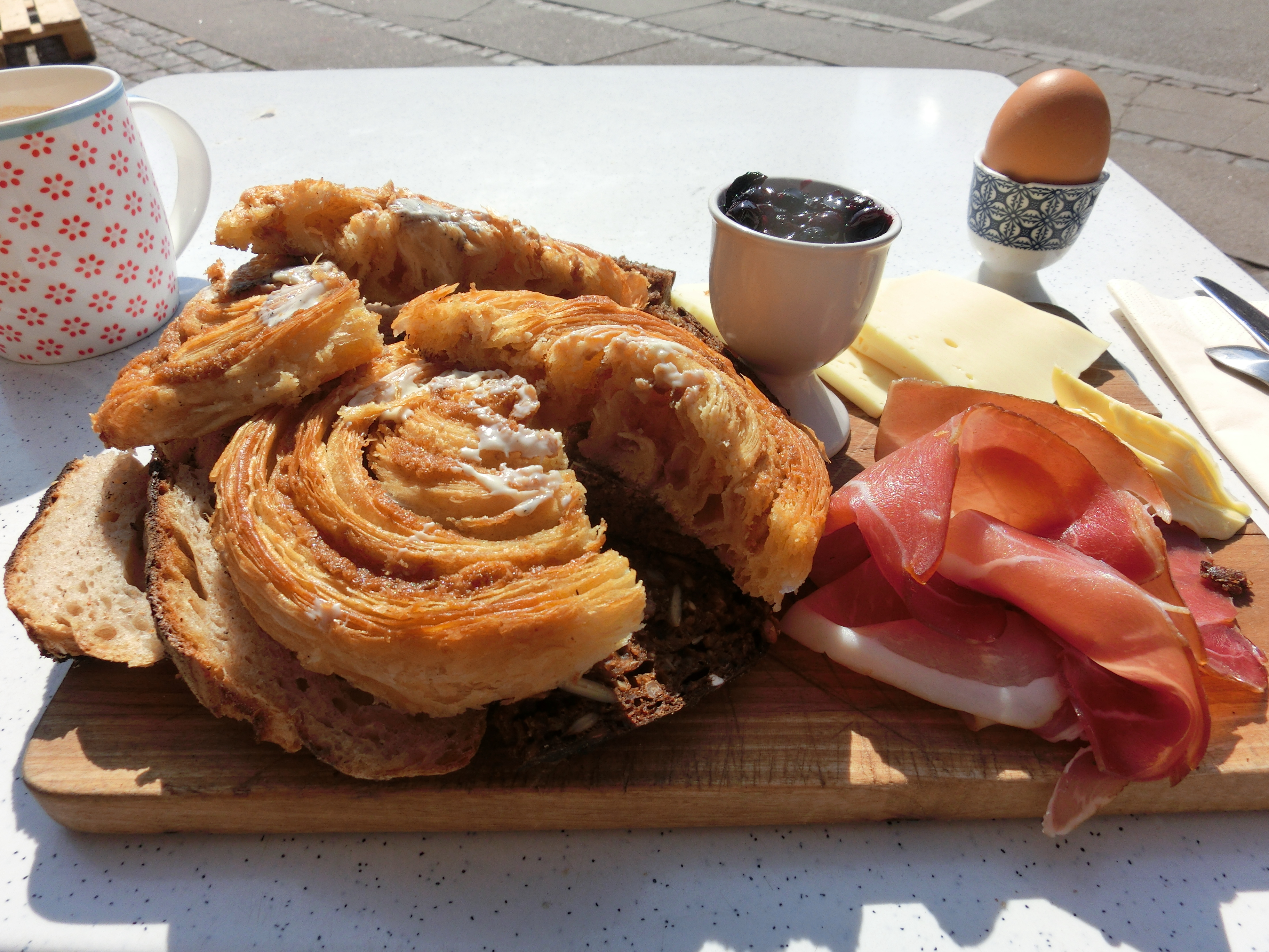 I have seen a number of photos on Instagram of the Nordisk Brødhus just in Nørrebro, closed to the edge of Frederiksberg. I have had it on my to-visit list for a while and yesterday I finally made it. They have a short brunch menu chalked up on a board and I plumped for the large one, which for 100kr you get a coffee, pressed apple juice, two types of bread, a weinerbrød, boiled egg, cheese, ham and jam. It was huge and absolutely delicious.