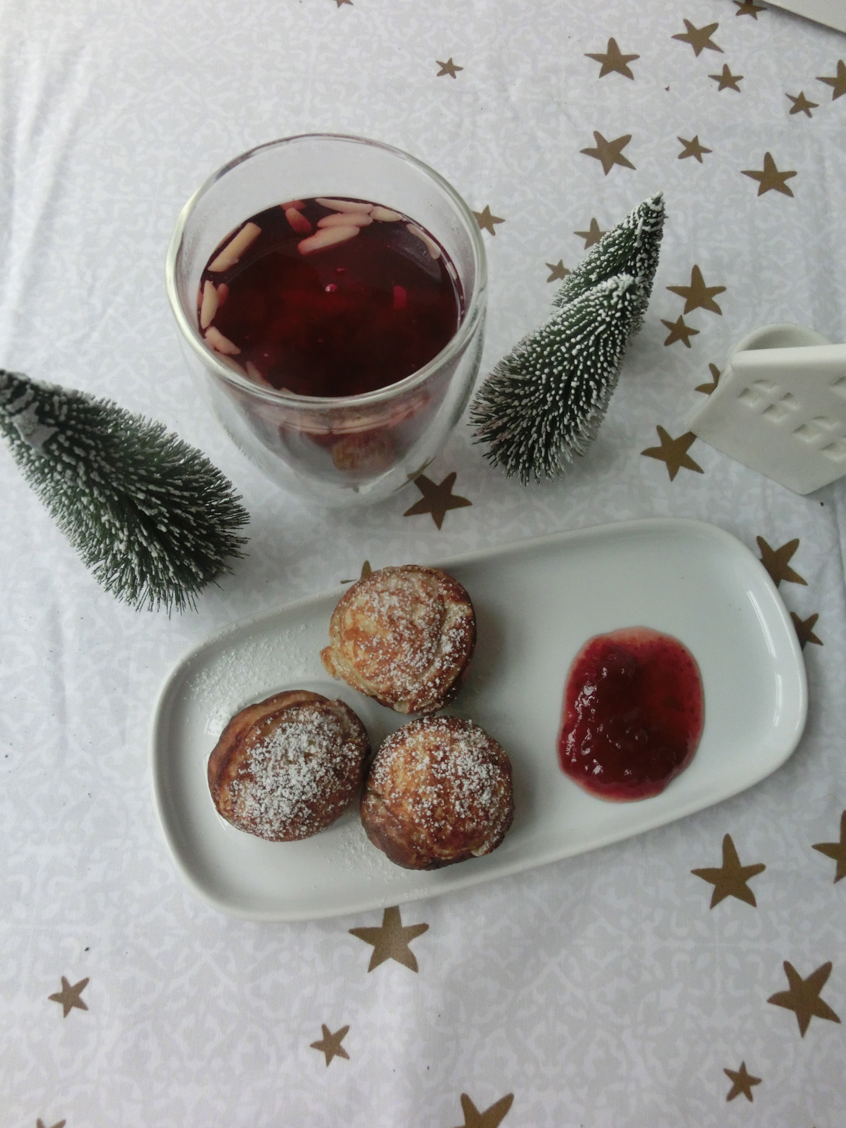 Once they are made, dust with icing sugar and serve warm with a little dollop of jam and a glass of gløgg, the Danish version of mulled wine with raisins and almonds floating in it. Perfect! Glædelig Jul!